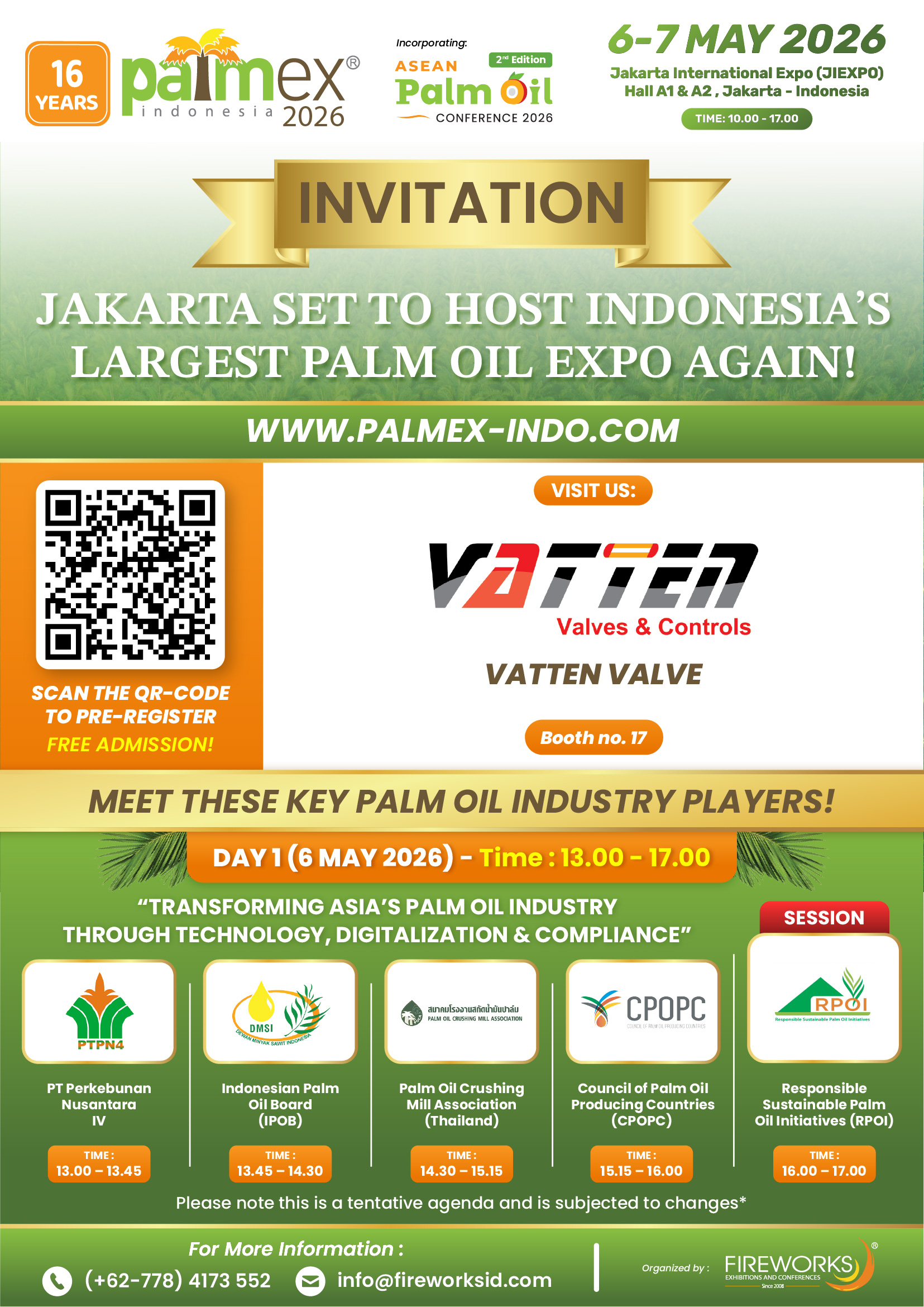 VATTEN Valves akan memamerkan produk inti pengontrol cairan kami dan mendiskusikan peluang baru dalam industri minyak sawit dengan Anda.