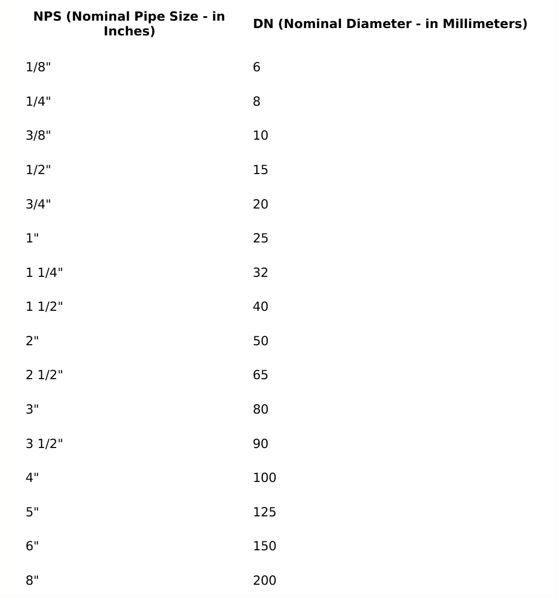 Namun, ada pengecualian. Misalnya, 3" × 25 = 75, yang dibulatkan menjadi DN80. Ada juga dimensi inci dengan pecahan atau desimal seperti 1/2", 3/4", 1-1/4", 1-1/2", 2-1/2", 3-1/2", ini tidak dapat dihitung seperti itu, tetapi perhitungannya kira-kira sama, sebagian besar merupakan nilai standar :