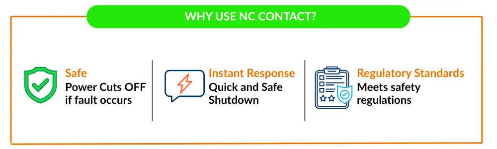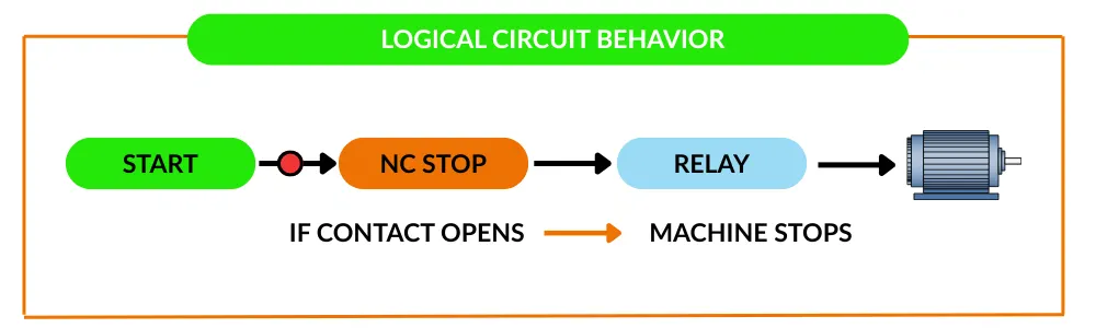 Menggunakan kontak NC dalam sebuah pemberhentian darurat sirkuit mendukung perilaku gagal-aman secara alami.